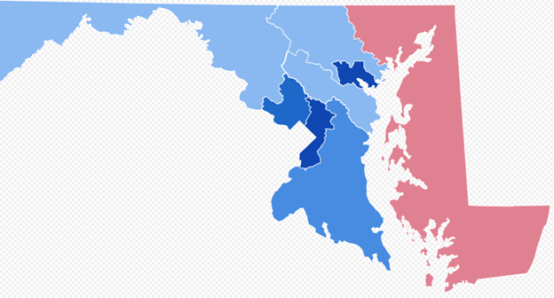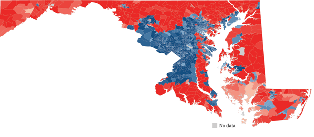 Maryland is perhaps the most egregious. Look how much red there is in Maryland as opposed to the way districts are drawn.
